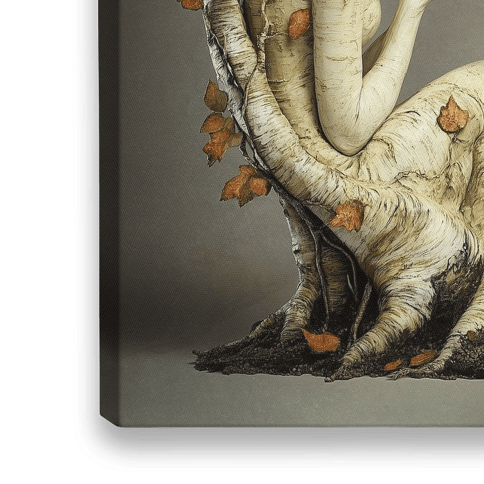 Dit schilderij toont een betoverende boomnimf, die prachtig is verweven met een berkachtige stam. Haar huid lijkt uit de schors te zijn gevormd, met een delicate textuur die natuurlijke verweerdheid weerspiegelt. De nimf zit in een introspectieve houding, haar gezicht rustend op haar hand, alsof ze diep in gedachten verzonken is. Haar…