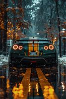 Een prachtige Nissan GT-R R35 gefotografeerd in een besneeuwd herfstbos. De oranje achterlichten en gele racestrepen contrasteren prachtig met de koude, blauwe wintermist. Een meesterwerk van kleur en kracht.