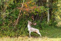 Een lichte damhertbok strekt zich sierlijk uit om een blaadje van een tak te pakken — een klein gebaar vol gratie en leven. Om hem heen kleuren de bladeren in warme herfsttinten, als een schilderachtig decor. Zijn houding is gespannen maar zacht, een moment van natuurlijke elegantie. Deze foto vangt de poëzie van het seizoen en de…