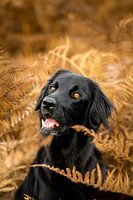 Deze hartverwarmende foto toont een zwarte Hovawart hond, genesteld tussen de gouden varens in de volheid van de herfst. De warme kleuren van het seizoen omlijsten zijn glanzende vacht en de levendige glinstering in zijn ogen verraadt een speelse geest. De diepte van de herfsttinten en de nobele uitstraling van de Hovawart creëren een beeld van rustieke schoonheid. Dit portret van een trouwe metgezel in de schoot van de natuur is een ode aan de tijdloze band tussen mens en hond en zou een aanstekelijke vreugde brengen in elk huis.