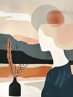 Dit kunstwerk is een serene en introspectieve compositie die de verbinding tussen mens en natuur weerspiegelt. Centraal in de afbeelding staat een gestileerd vrouwelijk silhouet, weergegeven in zachte, vloeiende lijnen. Haar gezicht is naar rechts gekeerd, met een rustige en contemplatieve uitstraling. Achter haar hoofd zweeft een grote, oranje cirkel, die doet denken aan de zon of de maan, en bijdraagt aan de dromerige sfeer van het kunstwerk.