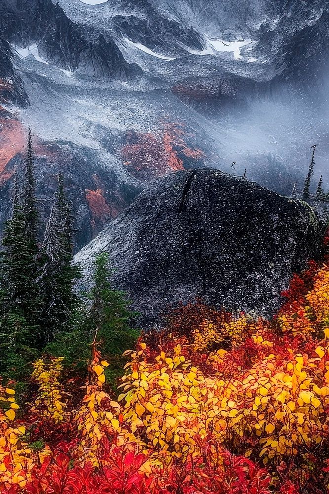 Majestueuze bergen rijzen op te midden van prachtige rode en gele bladeren, gehuld in mystieke mist. Deze levendige weergave van de natuur combineert kracht en rust en creëert een harmonieuze sfeer. Het kunstwerk is ideaal voor de woonkamer, nodigt uit tot dromen en brengt warmte in elke kamer.