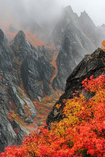 Majestueuze, ruige bergen torenen uit te midden van mysterieuze nevels, terwijl helder rood en oranje gebladerte het tafereel verlichten. Dit dynamische kleurenpalet straalt een gevoel van avontuur en gezelligheid uit, waardoor het kunstwerk de perfecte toevoeging is aan een woonkamer die natuur en creatieve inspiratie verwelkomt.