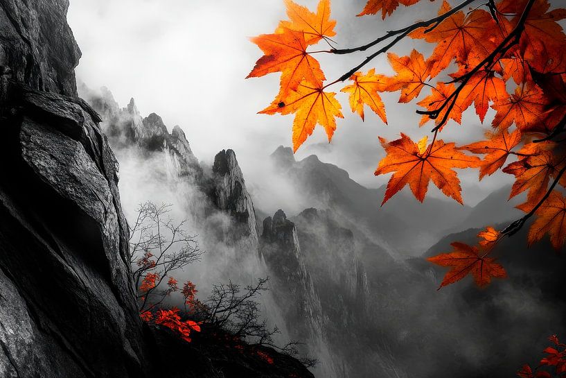 Een majestueus berglandschap rijst op in zachte grijstinten, gehuld in mysterieuze mist. Fel oranje gekleurde bladeren gloeien als zonnestralen en geven het beeld een vleugje levendigheid. Dit artistieke meesterwerk voegt een rustgevende en inspirerende sfeer toe aan elke woonkamer.