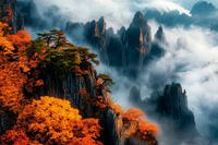 Een bedwelmend kleurenspel van fel oranje en zachte mist streelt de indrukwekkende rotsen. De mysterieuze sfeer van het landschap ontvouwt zich majestueus en nodigt uit tot kalmte en reflectie. Perfect voor de woonkamer, waar natuurlijke schoonheid en een gevoel van harmonie de ruimte vullen.