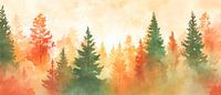 Een dromerig boslandschap schittert in zachte, warme kleuren, met kleurrijke bladeren en hoge, trotse dennenbomen die harmonieus in elkaar overgaan. Dit tafereel straalt rust en geborgenheid uit, ideaal voor in de woonkamer, waar het gezellige gesprekken en ontspannende uurtjes begeleidt. Een perfecte blikvanger die de natuur in huis…