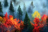 Verborgen in een mysterieuze mist ontvouwt zich een kleurrijk samenspel van helder rood en stralend goud, terwijl machtige dennenbomen het tafereel omlijsten. Deze harmonieuze combinatie van warme herfsttinten en mystieke stemming creëert een uitnodigende sfeer, perfect voor de woonkamer, waar het gezelligheid en inspiratie combineert.