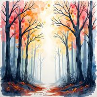 Dit aquarel schilderij vangt de serene schoonheid van een bospad in het hart van de herfst. Hoge, donkere bomen met kale takken omlijsten een mistige, lichte open plek. Het gebladerte erboven gaat over in levendige tinten rood, oranje en geel, wat de piek van de herfstkleuren suggereert. Een zacht pad, bespikkeld met gevallen bladeren en een vleugje water, leidt de kijker dieper de rustige scène in. De zachte, gemengde kleurvlakken creëren een etherische en vredige sfeer.