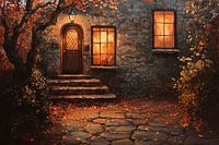 De zachte schemering omhult het charmante stenen huis, waarvan de warme ramen uitnodigend oplichten. Knoestige takken en herfstbladeren omlijsten de deur, terwijl het geplaveide pad in duisternis baadt door de lichten. Een mysterieuze sfeer nodigt je uit om de verhalen achter deze muren te ontdekken.