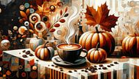 Deze illustratie is een eerbetoon aan de levendige kleuren en vormen van de herfst. In het midden staat een kop koffie waarvan de stoom samensmelt met herfstbladeren en pompoenen om een gevoel van het seizoen over te brengen. De warme oranje tinten en diepe bruintinten creëren een beeld dat zowel de ogen als de ziel verwarmt. De verschillende cirkels en spiralen op de achtergrond suggereren de diversiteit van de herfstige natuur en haar dynamische verandering. Het beeld is vol beweging en toch in perfecte balans en nodigt de kijker uit in een wereld van smaken en visuele pracht.
