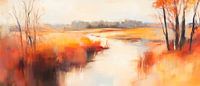 Zachte kleuren in warme oranje en gele tinten omarmen de stromende waterloop die zich door een rustig landschap slingert. De glinsterende weerspiegelingen en het zachte lichtspel dompelen de kijker onder in een vredige natuurlijke wereld. Dit schilderij is perfect voor de woonkamer en creëert een harmonieuze en ontspannen sfeer.
