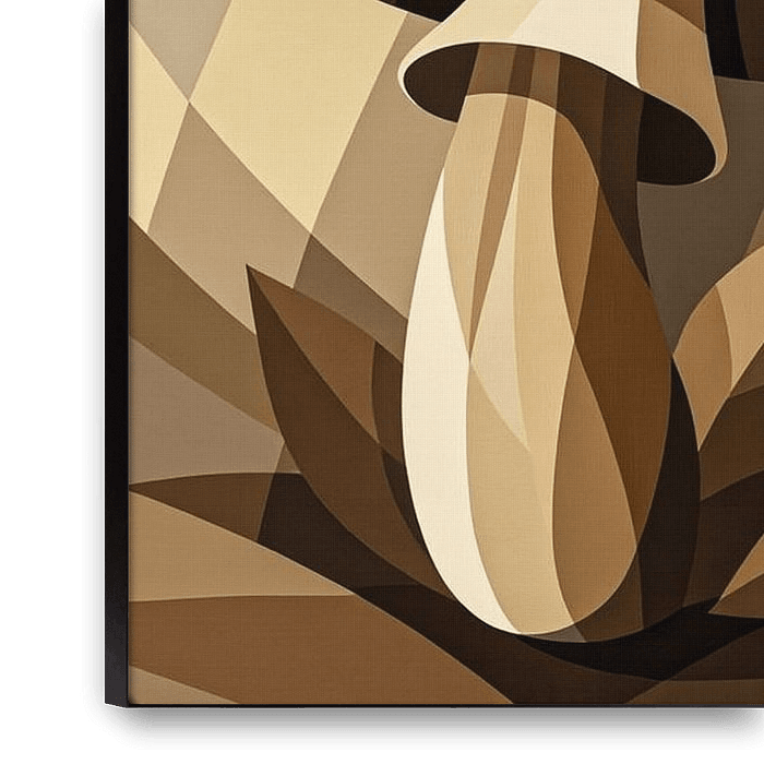 Dit moderne kunstwerk toont een paddenstoel in warme aardetinten, uitgevoerd in een abstracte en geometrische stijl. De strakke vormen en gelaagde kleurvlakken zorgen voor een eigentijds en minimalistisch effect, terwijl de zachte schakeringen in beige, bruin en crème een gevoel van rust en natuur oproepen. Het werk ademt de sfeer van…