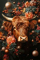 Deze prachtige afbeelding vangt de warme, aardse schoonheid van een Schotse hooglander koe omgeven door een herfstachtige compositie van bloemen, bessen en gouden kerstballen. De rijke tinten oranje, rood en goud benadrukken de textuur van de vacht en voegen een feestelijke, maar toch natuurlijke sfeer toe. De gedetailleerde bloemen en…