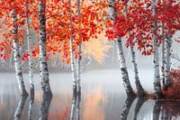 Gouden en rode bladeren dansen in de zachte mist, terwijl tere berkenbomen hun glans weerspiegelen in het stille water. Deze harmonieuze compositie van natuur en rust creëert een uitnodigende sfeer die ideaal is voor een woonkamer om gezelligheid en de schoonheid van de seizoenen te vieren.