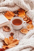 Een knus nestje van zacht, gebreid materiaal omhult een dampende kop thee en straalt warmte en comfort uit. Omringd door gouden herfstbladeren en geurige sinaasappelschijfjes ontvouwt zich een uitnodigende sfeer. Een open boek suggereert ontspannen uren lezen en geeft het moment een speciaal, nostalgisch tintje.