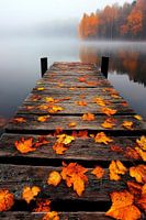 Koop dit landschapskunstwerk Herfstige houten plank bij het meer van Poster Art Shop op canvas, aluminium dibond, (ingelijste) fotoprint, behang en ArtFrame, op maat geprint in Fine-Art kwaliteit.