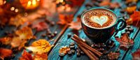 Een dampende koffiemok, kunstig versierd met een hartvormig patroon, creëert een warm gevoel van gezelligheid. Omringd door kleurrijke herfstbladeren en geurige kaneel straalt dit tafereel een uitnodigende sfeer uit. Ideaal voor in de keuken of woonkamer, het nodigt je uit om te ontspannen met een kopje koffie.
