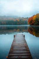 Er ontvouwt zich een rustig paradijs, waar de zachte glinstering van het water samensmelt met de warme kleuren van de herfst. De houten loopbrug, die schuchter de mist in leidt, nodigt uit tot een meditatieve wandeling. Omlijst door glooiende heuvels en weerspiegelend water straalt het tafereel rust en tijdloze schoonheid uit.