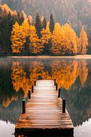 Een droomachtige loopbrug van warm, verweerd hout leidt zachtjes over het spiegelgladde oppervlak van een glinsterend meer. Omringd door gloeiende gouden en oranje bomen die schitteren in het zachte licht van de herfstzon, creëert het tafereel een fascinerende harmonie van kleuren en rust - uitnodigend en mystiek tegelijk.