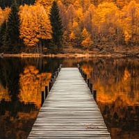 Badend in zachte gouden en oranje tinten ontvouwt zich een schilderachtige houten loopbrug die in het stille water leidt. De omringende bomen gloeien in herfstpracht en worden weerspiegeld in het gladde meer. Een vredig toevluchtsoord dat uitnodigt om te vertoeven en te dromen terwijl de natuur schittert in al haar kleurrijke glorie.