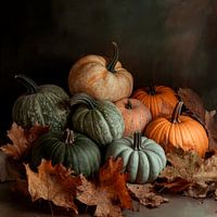 Een schilderachtig stilleven viert de kleurrijke pracht van de herfst: weelderige pompoenen in zachte tinten groen en fel oranje troon als juwelen tussen verdorde bladeren. Hun verschillende vormen en texturen creëren een harmonieuze compositie die doet denken aan de warme, gouden dagen en de naderende festiviteiten. Een feest voor de zintuigen!