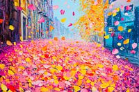 Een kleurrijke caleidoscoop van bloemblaadjes danst zachtjes in de wind en verandert de straat in een levendige zee van roze en geel. Dit sfeervolle tafereel brengt de magie van de herfst in huis en is ideaal voor een woonkamer, waar het gezelligheid en levensvreugde uitstraalt.