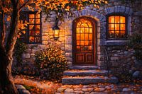 Te midden van de zachte herfstkleuren straalt de verlichte voordeur als een uitnodigend geheim. Geoliede houten panelen en gebogen stenen treden vertellen verhalen van vervlogen tijden, terwijl het flikkerende licht door de ramen naar buiten filtert. Een zacht briesje laat de kleurrijke bladeren dansen en geeft het tafereel een magische…