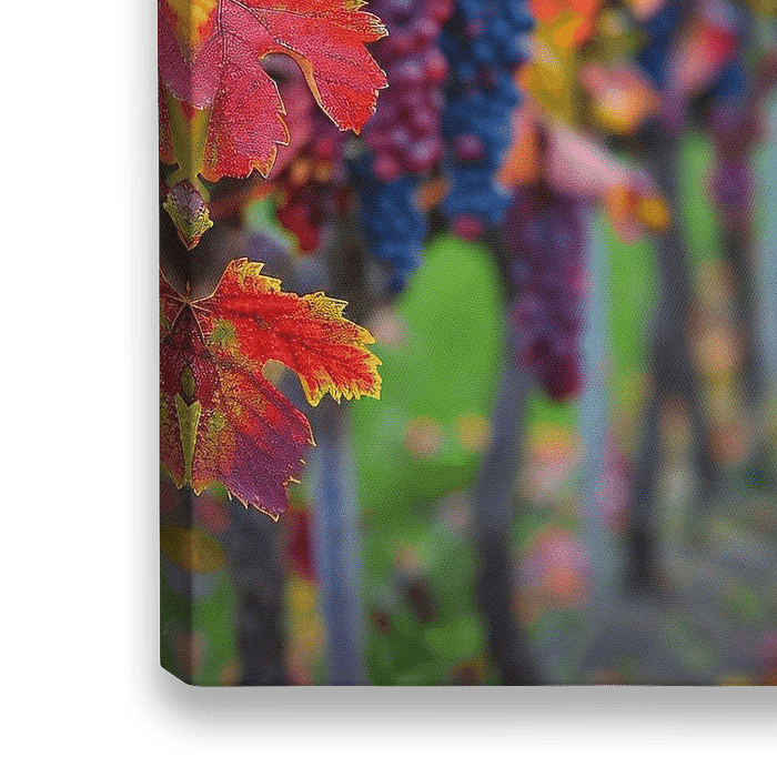 Dit levendige ontwerp brengt de essentie van een herfstwijngaard tot leven, waarbij het zachte licht van de ondergaande zon de veelkleurige bladeren en rijpende druiventrossen in een warme gloed zet. De harmonie tussen natuur en landbouw spreekt uit elke kleurrijke piel, terwijl de symmetrie van de rijen wijnstokken zorgt voor een rustgevende regelmaat en diepte in het beeld. Dit tafereel ademt de rijke traditie van de wijnbouw, een getuigenis van geduld en toewijding die terugkomt in elke fles die van deze druiven gemaakt wordt. Het is een ode aan de herfst, een seizoen van overvloed en voorbereiding, een tijd waarin de natuur zich kleedt in haar meest flamboyante tinten voordat de winter arriveert.