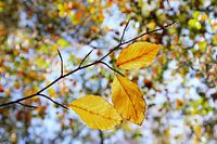 Een beeld van de schoonheid van de herfst. Drie herfstbladeren van een beukenboom tegen een achtergrond die vol is van herfstkleuren.