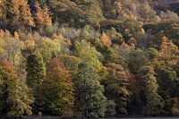 Vroeg ochtendlicht schijnt over het bos in Borrowdale, gelegen in het Engelse Lake District. Begin November hebben de bomen al mooie herfstkleuren,