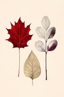 Met een harmonieus samenspel van vormen en kleuren stralen deze bladeren levensvreugde en elegantie uit. De levendige rode kleur van het esdoornblad past harmonieus bij de zachte tinten van de andere bladeren en straalt rust en sereniteit uit. Ideaal voor in de woonkamer, brengt een vleugje natuur en stijl in huis.