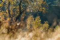 Een mooie herfstdag in het Hulsthorster Zand op de Veluwe bij Nunspeet. Het verkleurde blad van de berkenboompjes lijkt wel van goud gemaakt in het vroege ochtendlicht en steekt mooi af tegen de donkere bosrand op de achtergrond.