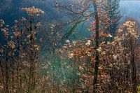 Feeëriek beeld van uitgebloeide bloemen, herfstbladeren en invallend zonlicht in een bosgebied in Duitsland. De verdorde bladeren en de wit oplichtende zaadpluizen steken scherp af tegen de wat wazige, mistige achtergrond die door de lage zon bijzondere kleuren krijgt.