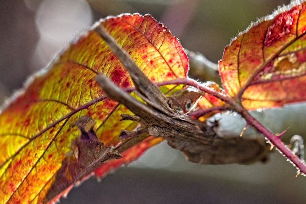 Mooie herfstkleuren in het heldere winter tegenlicht bij deze bladeren in het Eyserbos.