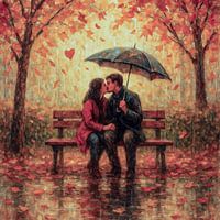 Deze romantische kunstprint vertelt het verhaal van liefde in de herfst. Twee geliefden delen een intieme kus op een bankje, beschut onder een paraplu terwijl de regen zachtjes valt. De bomen om hen heen kleuren warm oranje en rood, en dwarrelende bladeren geven het tafereel een sprookjesachtige sfeer. Tussen de vallende bladeren verschijnt subtiel een hartje een symbool van warmte en verbondenheid.
