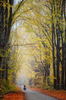 Op deze herfstlaan in Eelde bij Groningen komt een fietser in onze richting fietsen. Het is een beetje mistig. De bomen hebben een mooie herfstkleur.