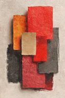 Dit werk toont een stapeling van rechthoekige vlakken, elk met een eigen textuur en kleur. Diep rood, warm oranje en subtiel beige worden gecombineerd met donkere grijstinten, waardoor een gelaagd geheel ontstaat dat zowel krachtig als ingetogen oogt. De oppervlakken zijn ruw en onregelmatig, alsof ze met grove penseelstreken of bijna collage-achtig op elkaar zijn geplaatst.