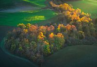 Herfstlandschap, glooiende heuvels en kleurrijke hartvormige bossen bij zonsondergang in Crete Senesi. Asciano, Siena, regio Toscane, Italië, Europa.