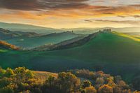 De foto toont een herfstzonsondergang, die een warm, gouden licht werpt op de glooiende heuvels. Het spel van schaduwen en licht creëert een betoverend effect dat het golvende terrein en de levendige kleuren van het seizoen benadrukt. Op de heuveltoppen zijn een paar traditionele Toscaanse boerderijen (casolari) zichtbaar, die een vleugje rustieke charme aan het tafereel toevoegen.