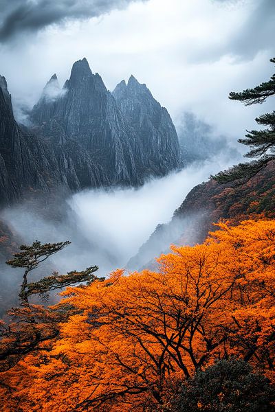 Er ontvouwt zich een indrukwekkend tafereel in gloedvolle herfsttinten, waar majestueuze bergen oprijzen uit een mystieke mist. De oranjekleurige bladeren geven het beeld een warme uitstraling en nodigen uit tot dagdromen. Ideaal voor in de woonkamer, het creëert een rustgevende sfeer en brengt de natuur in huis.