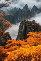 Een majestueus kleurenspel ontvouwt zich in fel oranje, omlijst door mysterieuze, met wolken bedekte bergen. De levendige herfsttinten stralen een kalmerende energie uit en nodigen je uit om te dromen. Dit kunstwerk past perfect in de woonkamer en creëert een sfeer van rust en inspiratie die uitnodigt om te blijven hangen.