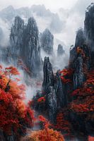 Majestueuze rotsen rijzen op in het midden van een mystiek mistig landschap, omringd door helderrode en gouden bladeren. Deze harmonieuze combinatie van natuur en kleur voert de kijker mee naar een andere wereld. Ideaal voor een slaapkamer, creëert het een kalme, inspirerende sfeer die uitnodigt om te dromen en te ontspannen.