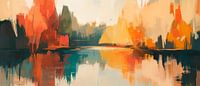 Een schilderachtig landschap ontvouwt zich in zachte, levendige kleuren en weerspiegelt de rust van een watermassa. De harmonieuze combinatie van warm rood, oranje en geel belichaamt de schoonheid van de herfst en geeft elke kamer een uitnodigende sfeer. Ideaal voor een woonkamer om gezelligheid en inspiratie te bevorderen.