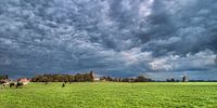 Onstuimige herfstlucht boven het Friese dorpje Wanswerd met zijn herkenbare windmolen en zadeldak-kerkje en het vee nog op t land.