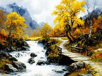 Stilte heerst in de bergen, alleen onderbroken door het geluid van water dat over de rotsen danst. De herfst heeft de vallei omgetoverd tot een kleurrijk landschap waarin de felle gele en oranje tinten van de bladeren harmoniëren met de koele tinten van de lucht. De brug van ruwe houten balken overspant de beek en verbindt twee werelden: de oprijzende bergen en de zacht glooiende vallei. Het pad leidt langs het water door een kleurrijke natuurlijke omgeving en nodigt iedereen die erop wandelt uit om de rust en schoonheid van de herfst in zich op te nemen.