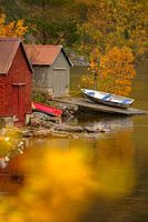 De herfstkleuren in Noorwegen zorgen voor een magische atmosfeer, waarin elke wandeling en elk uitzicht een nieuwe explosie van kleuren biedt. De botenhuisjes, vaak gebruikt om vissersboten en uitrusting op te slaan, vormen een idyllisch beeld te midden van deze herfstpracht. Ze staan symbool voor het traditionele Noorse leven aan het water, waar men al eeuwenlang in harmonie met de natuur leeft.
