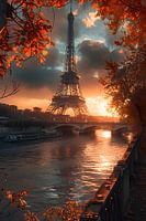 De foto toont de iconische Eiffeltoren die majestueus aan de oevers van de Seine in Parijs staat. De warme kleuren van de zonsondergang baden het tafereel in een gouden licht en laten de toren stralen in herfstige pracht. Het kalme water van de Seine weerspiegelt de heldere kleuren van de lucht en versterkt de romantische sfeer. De roodachtige bladeren van de bomen geven het beeld een extra herfsttintje en voegen een vleugje melancholie toe. De aanblik van de Eiffeltoren tegen de schilderachtige achtergrond van de herfstzonsondergang is een perfecte mix van schoonheid, romantiek en nostalgie die elke kijker betovert.
