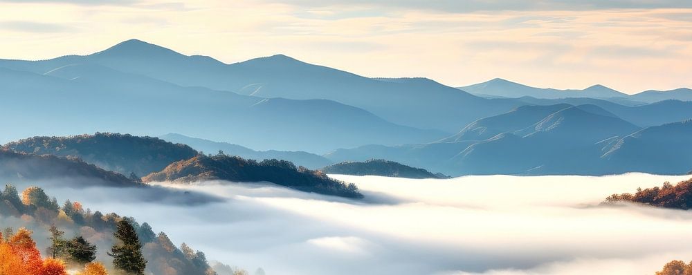 De afbeelding opent een venster naar een adembenemend herfstlandschap, waar de vroege ochtendnevel zachtjes tussen de heuvels en bergtoppen zweeft.