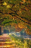 rustig wandelpad langs het water, gehuld in het warme licht van de herfstzon. De bomen vormen een natuurlijke tunnel van goudgele en oranje bladeren, waarin het zonlicht zacht speelt tussen de takken. Dit beeld is vastgelegd op een vroege herfstochtend op de Veluwezoom, toen de nevel nog laag hing en de kleuren extra intens waren.
