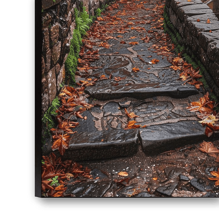 Wandel door de tijd met deze betoverende print van een eeuwenoud pad, omgeven door de warme kleuren van de herfst. De stenen, verweerd door de tand des tijds, vertellen verhalen van vervlogen tijden, terwijl de bladeren onder je voeten ritselen als fluisteringen uit het verleden. Breng de rustieke charme van de natuur in huis en laat je fantasie de vrije loop terwijl je je eigen verhalen creëert op dit betoverende pad.